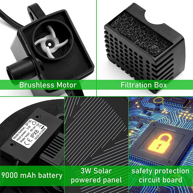 4. Новая усовершенствованная технология:Фонтан для хранения солнечной энергии-это ландшафтное фонтанное устройство, которое использует солнечные панели для зарядки аккумулятора и насоса воды. Этот продукт использует высокоэффективные солнечные панели и новый тип бесщеточного водяного насоса, который имеет преимущества быстрого запуска, высокой эффективности и сильной стабильности. Он будет продолжать предлагать водный цветок для вашего сада и патио. Просто очистка и поддержание.