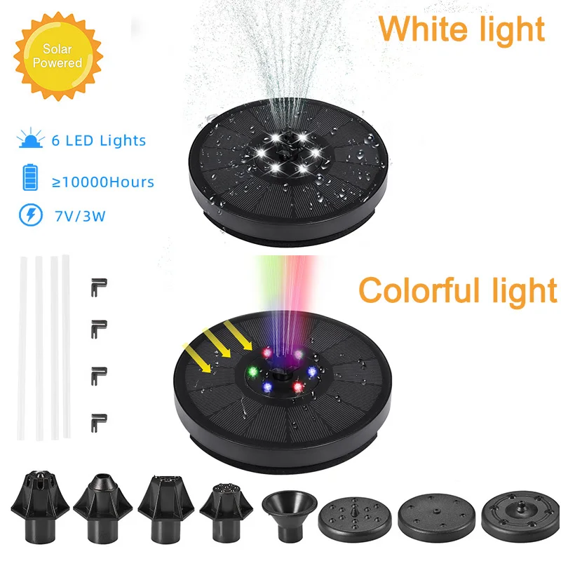 7. Новый солнечный фонтан с двумя режимами работы:Дневной режим, когда свет выключен, и Распылите воду; Ночной режим, когда свет включен, Распылите воду. Этот новый тип фонтана солнечного насоса очень подходит для птиц, аквариумов, небольших прудов, бассейнов, садов, террас, газонов и циркуляции кислорода. Его можно использовать в качестве фонтана распыления воды в течение дня, и можно использовать в качестве фонтана украшения ландшафтный светильник ночью, принося вам больше радости.