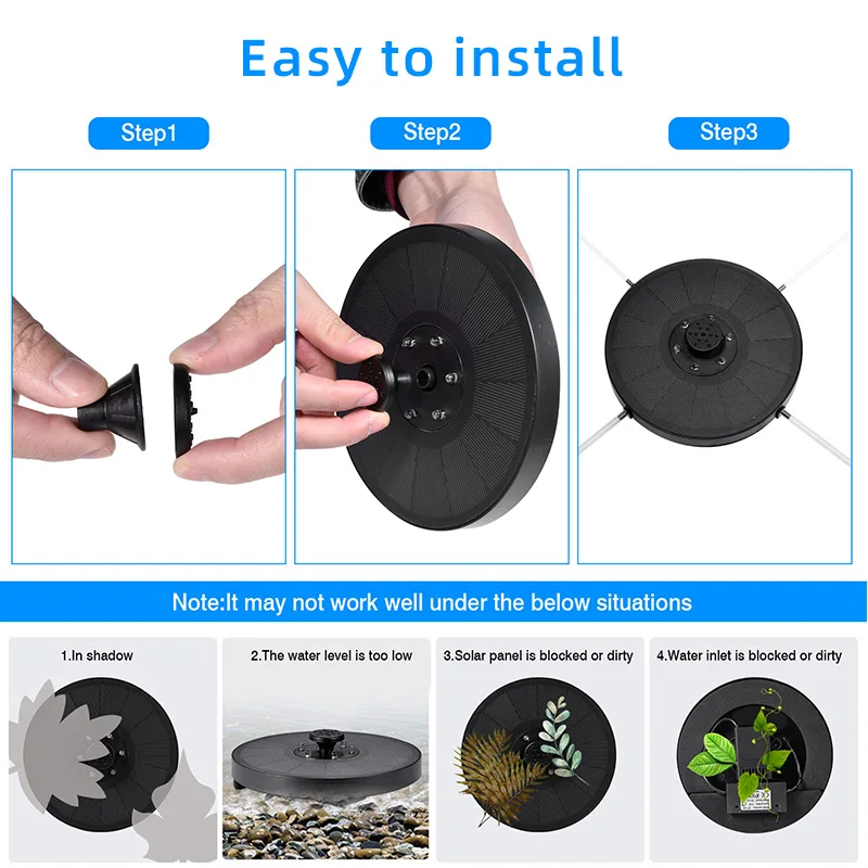 3. Держите поверхность солнечной панели чистой. Не используйте фонтан солнечного насоса в грязной или коррозионной воде. Часто меняйте воду, чтобы предотвратить попадание грязи в насос.