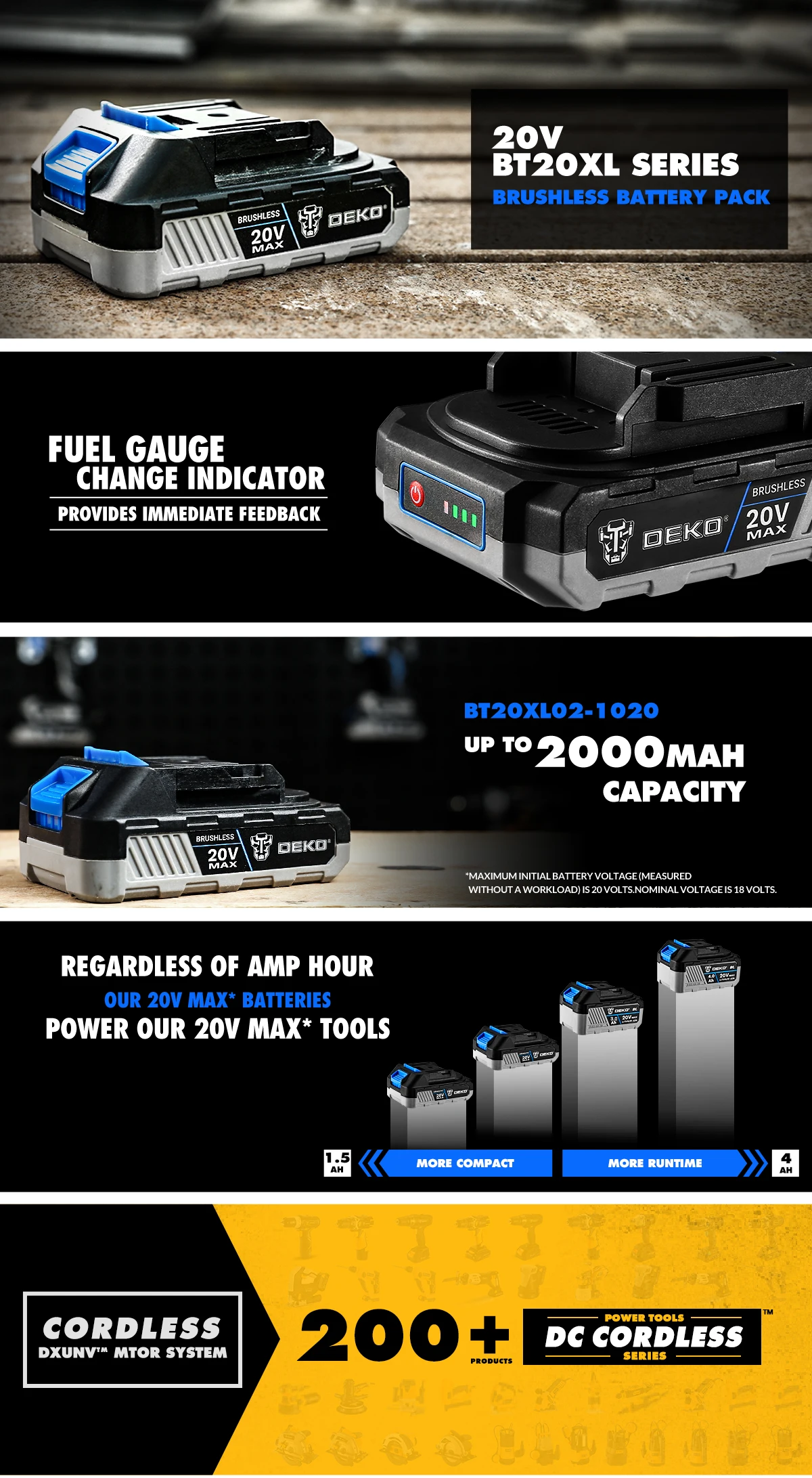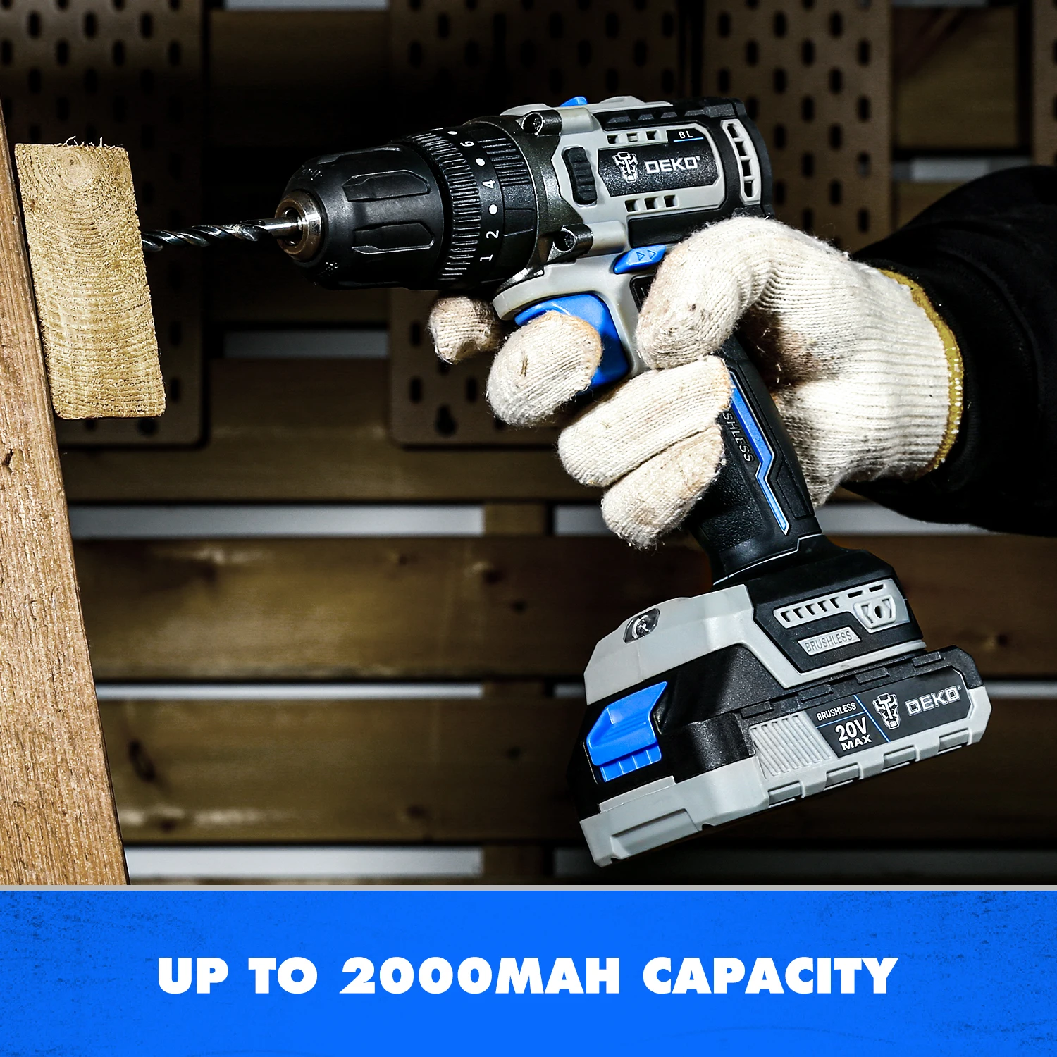 DEKO 20V литиевый 2000mAh бесщеточный Аккумуляторный набор инструментов для дрели DEKO бесщеточная серия (DKBL20DU3DKAG20BL01DKBW20XL01)
