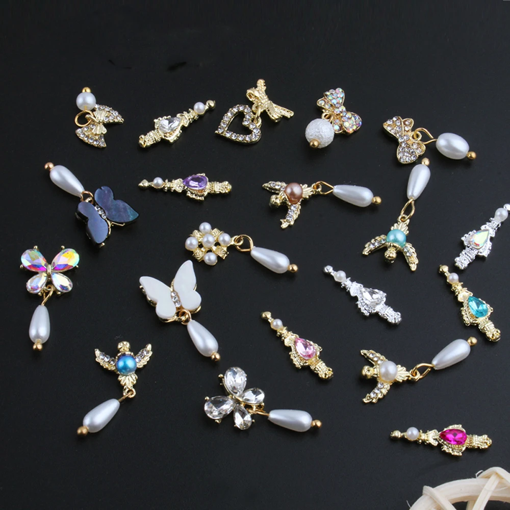10 шт. Ангел Висячие Подвески для ногтей 3D сердце бабочка жемчуг кулон Стразы наконечники для украшения ногтей УФ гель аксессуары для маникюра