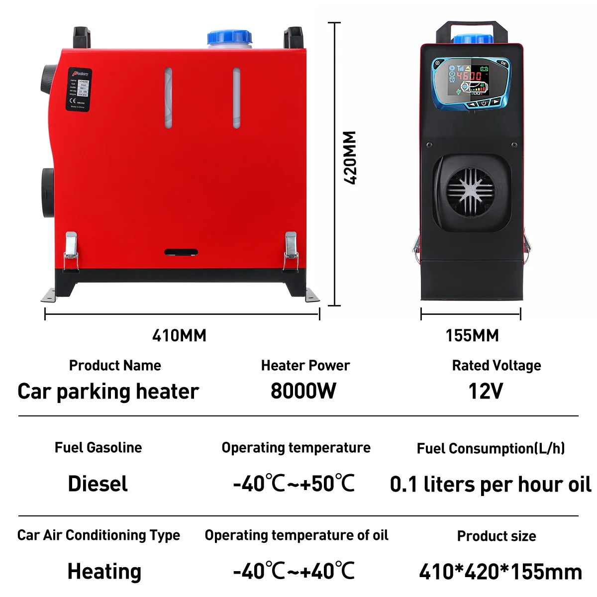 Посылка включает:1 хост воздушного нагревателя1 x ЖК-ключ1 пульт дистанционного управления2 х впускной трубы1 х выхлопная труба6 х соединительных труб для масла1 х масляный насос1 х воздушный фильтр1 х Кабель питания1 x Монтажные кронштейны1 ИнструкцияСпецификация:Материал: металл + пластикМощность: 1-8000 ВтНапряжение: 12 ВЦвет: красный + черныйРазмер: 42*41*15,5 смТопливо: ДизельПолный коэффициент сгорания: 100%Расход топлива: 0,1 литров/час маслоРабочая температура: -40 ℃ ~ 80 ℃Размер: 41*15,5*42 см/16,2*6,1*16,5"
