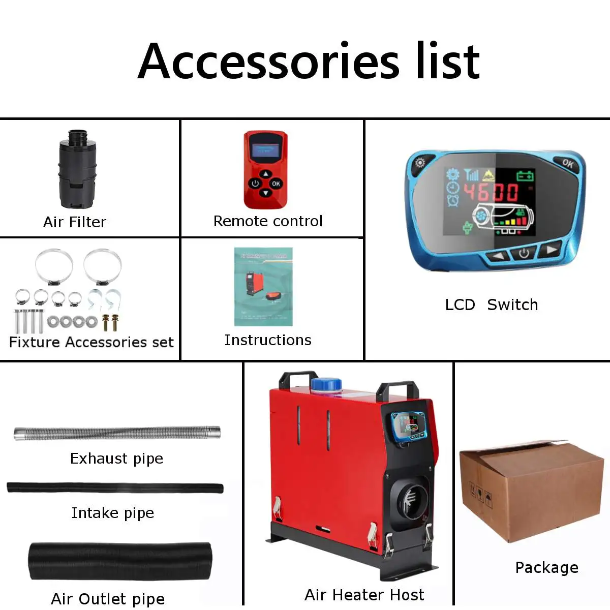 Посылка включает:1 хост воздушного нагревателя1 x ЖК-ключ1 пульт дистанционного управления2 х впускной трубы1 х выхлопная труба6 х соединительных труб для масла1 х масляный насос1 х воздушный фильтр1 х Кабель питания1 x Монтажные кронштейны1 ИнструкцияСпецификация:Материал: металл + пластикМощность: 1-8000 ВтНапряжение: 12 ВЦвет: красный + черныйРазмер: 42*41*15,5 смТопливо: ДизельПолный коэффициент сгорания: 100%Расход топлива: 0,1 литров/час маслоРабочая температура: -40 ℃ ~ 80 ℃Размер: 41*15,5*42 см/16,2*6,1*16,5"