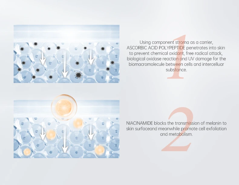 Используя компонент stroma в качестве носителя, аскорбиновая кислота полипептид проникает в кожу, чтобы предотвратить химический оксидант, свободные радикальные атаки, биологические оксидазы реакции и УФ-повреждения биомолекулы между клетками и интерцеллюарными веществами.Ниацинамид блокирует передачу меланина на поверхность кожи, а между тем способствует отшелушиванию клеток и метаболизму.
