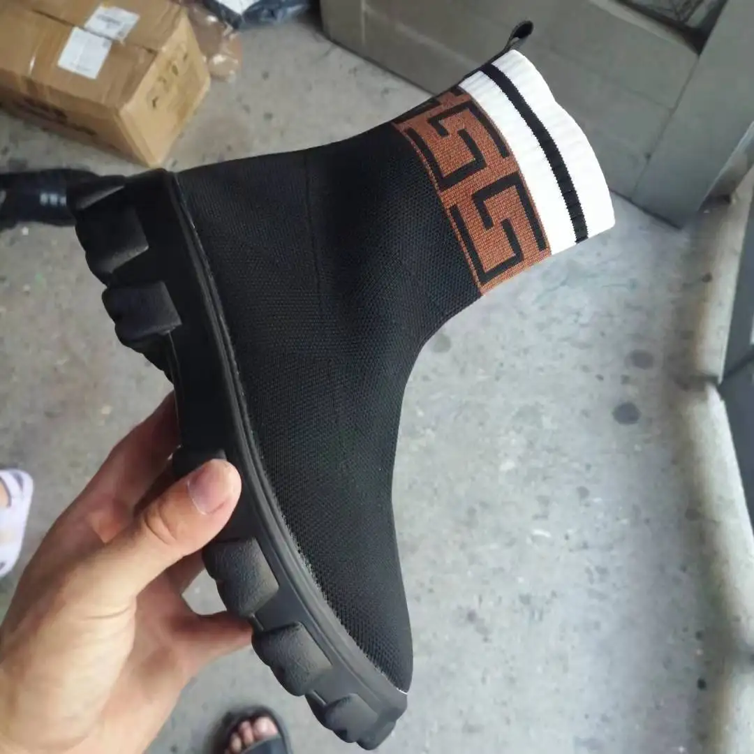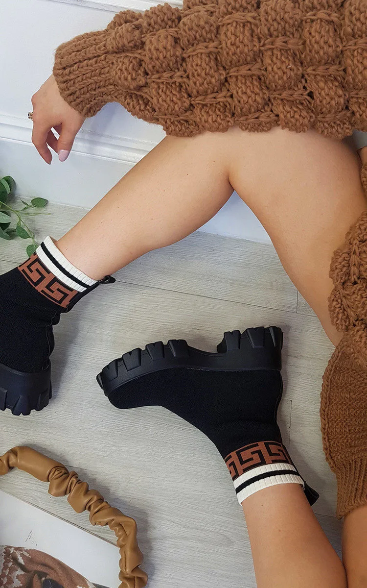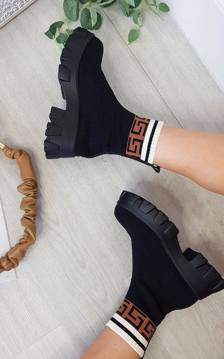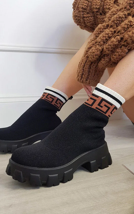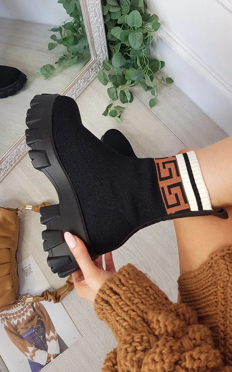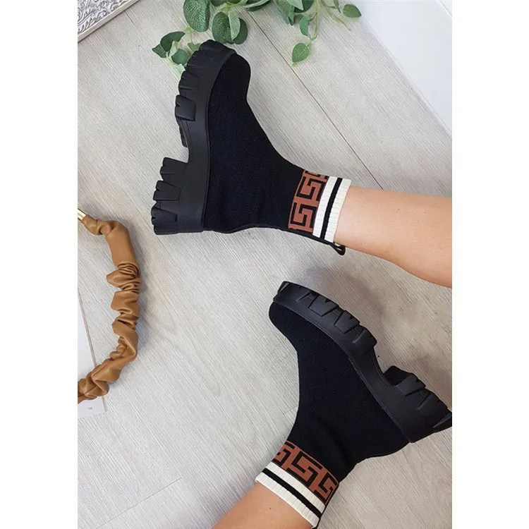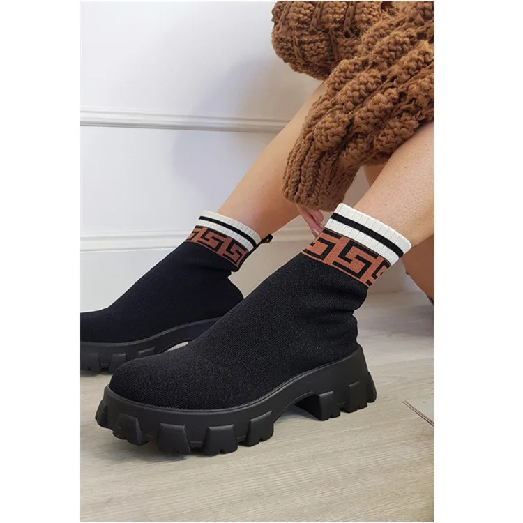 Кроссовки-носки женские на толстой подошве, вязаные короткие ботинки, теплые полусапожки, черные, Осень-зима