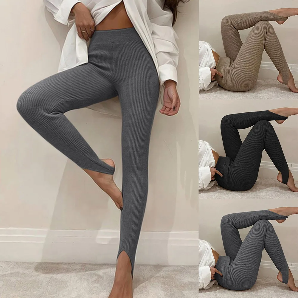 Трикотажные обтягивающие леггинсы в рубчик, женские осенне-зимние м...