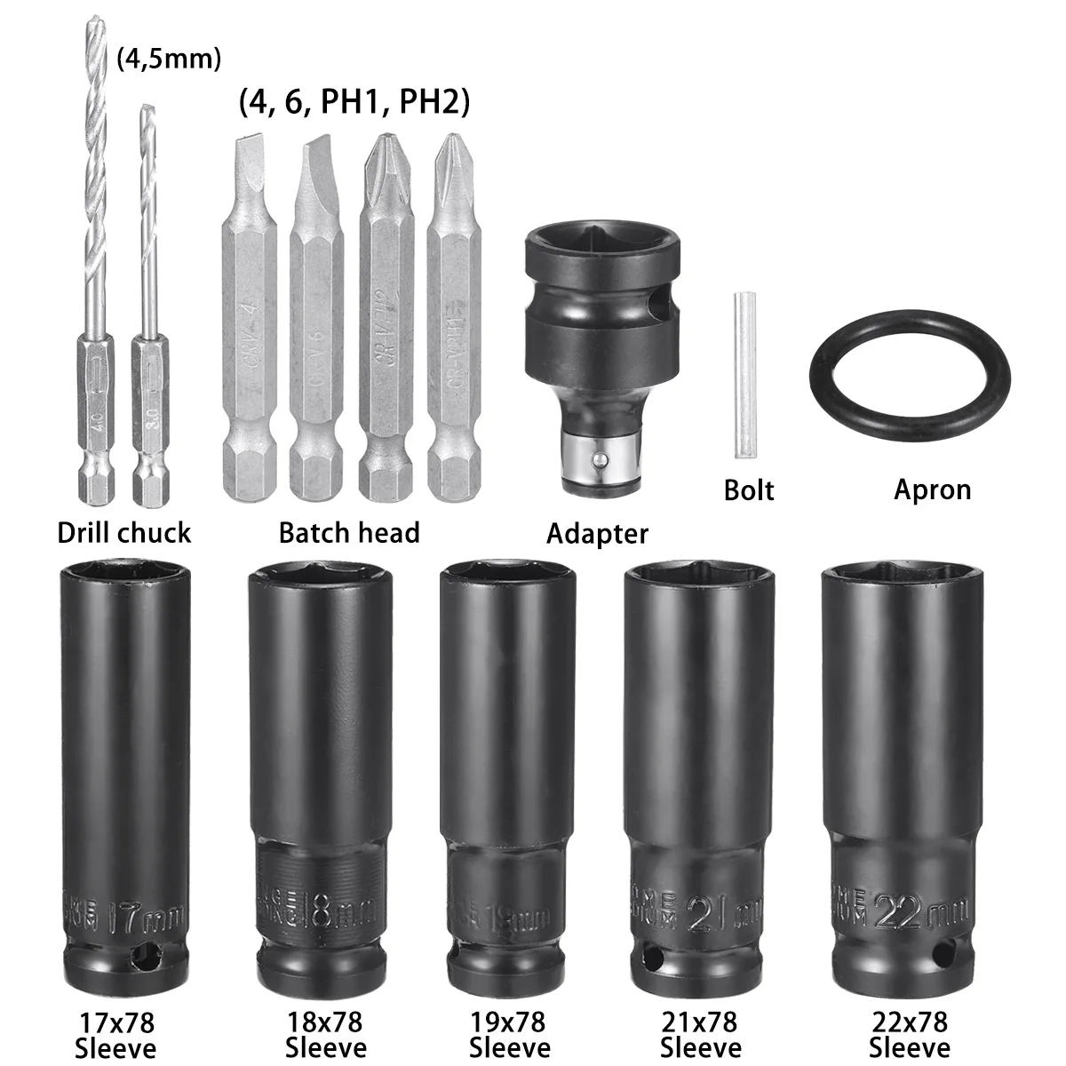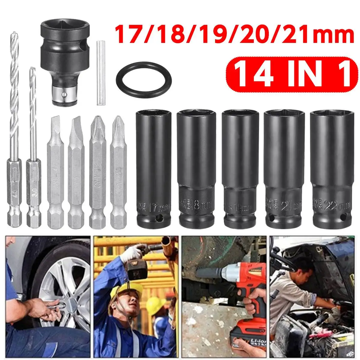 Набор электрических гаечных ключей 14 в 1, комплект с 5 втулками 17-22 мм и шестигранной головкой, ударный гайковерт, адаптер