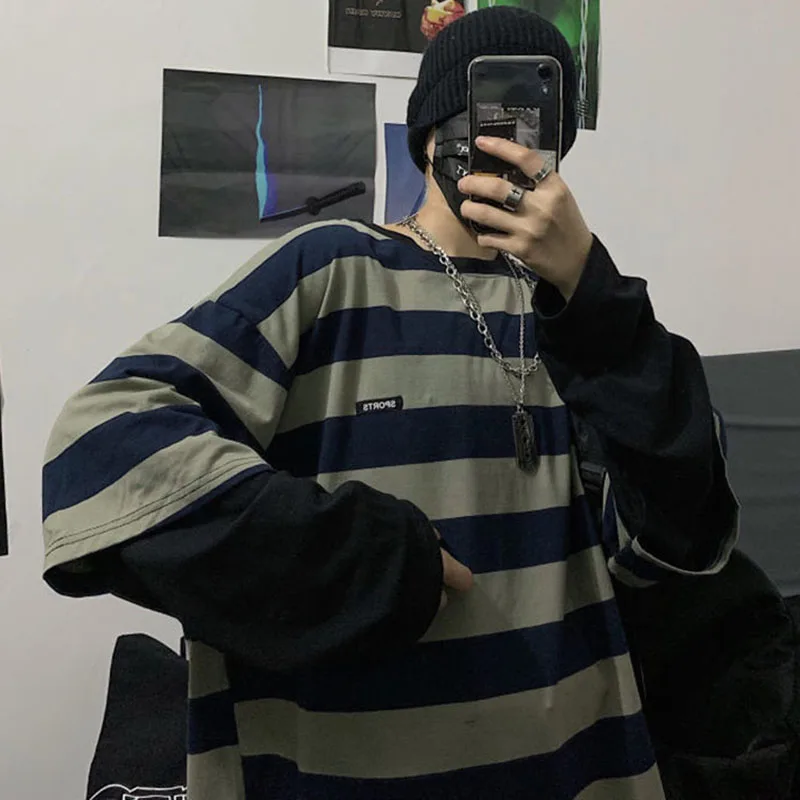 Футболка большого размера в стиле Харадзюку y2k, осенняя Футболка с имитацией двух частей, в полоску, с длинным рукавом, гранж, женская одежда с бесплатной доставкой