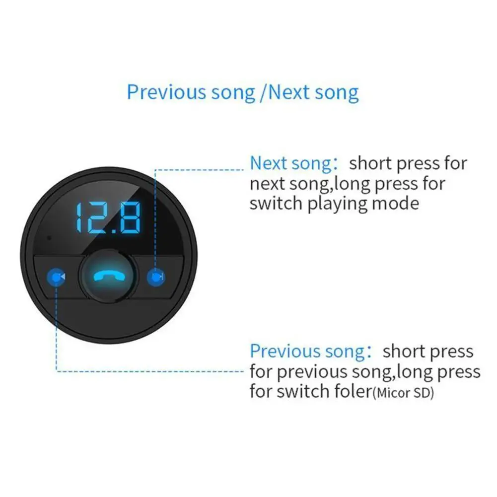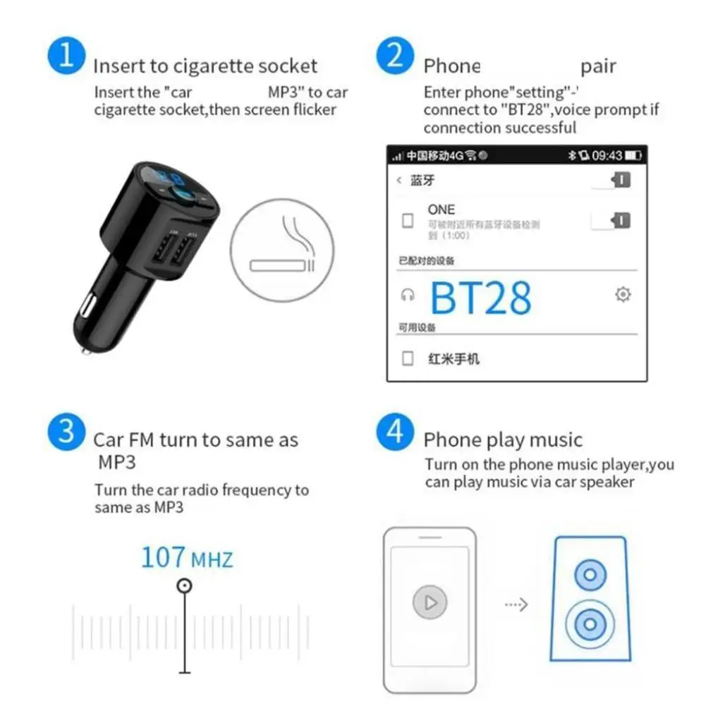 Характеристика:Автоматическое переключение из режима воспроизведения музыки в режим hands-free при ответе на вызовВстроенный микрофонНадежный дизайн с светодиодный дисплеемПоддержка повторного вызоваИнструкции по использованию1. Вставьте прикуриватель в гнездо прикуривателя автомобиля, вставьте mp3 bluetooth, а затем включите экран2. Мобильный телефон входит в настройки мобильный телефон для Bluetooth, подключается к BT28, и голосовые подсказки, что соединение успешно3. Fm-радио частота такая же, как MP3 Bluetooth4. Мобильный телефон, музыкальный плеер, может воспроизводить музыку через автомобильный динамикКлавиатура1. Короткая Кнопка паузы/воспроизведения2. При входящем звонке короткое нажатие для ответа на вызов (Длительное нажатие для ответа на вызов); При вызове или маркировке сцены короткое нажатие для поднятия руки; нажмите дважды, чтобы запомнить ваш последний звонок.3 Частота и назначение: Длительное нажатие в течение 3-5 секунд, при освежении экрана, в это время, нажмите трек,/предыдущий пункт, чтобы изменить частоту передачи4. Регулировка громкости: Нажмите и удерживайте в течение 3-5 секунд, когда экран мигает, в это время, нажмите на дорожку/чтобы изменить громкостьСпецификация:Тип: ABS проектТип: BluetoothОсобенности: fm-передатчикРазмер продукта: 3,5*3,5*8 см/1,4*3 ''(длина * ширина * высота)Модель продукта: BT28Поддерживаемые файлы: MP3 / WMA / WAV / APE / FLACПоддерживаемая емкость u-диска: класс 10, до 32 гВыход USB: максимум 5 В/2,1 АFM частота: 87,5-108 МГцПосылка включает в себя:1 × Bluetooth fm-передатчик