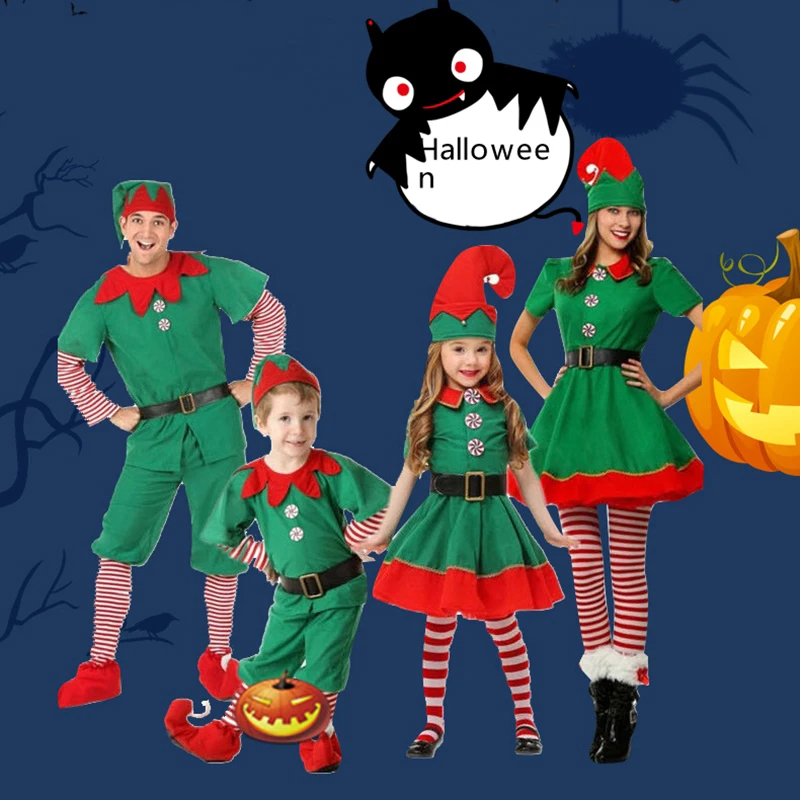 Костюм на Хэллоуин для взрослых и детей, зеленая Рождественская одежда эльфа, косплей, одежда для родителей и детей, мужской и женский костюм для рождественской вечеринки