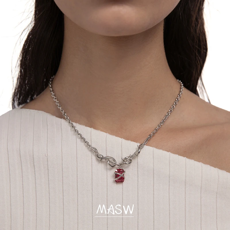 Ожерелье-цепочка MASW с оригинальным дизайном, однослойное простое дизайнерское металлическое серебристое ожерелье с кулоном из красного циркония AAA, женские Украшения