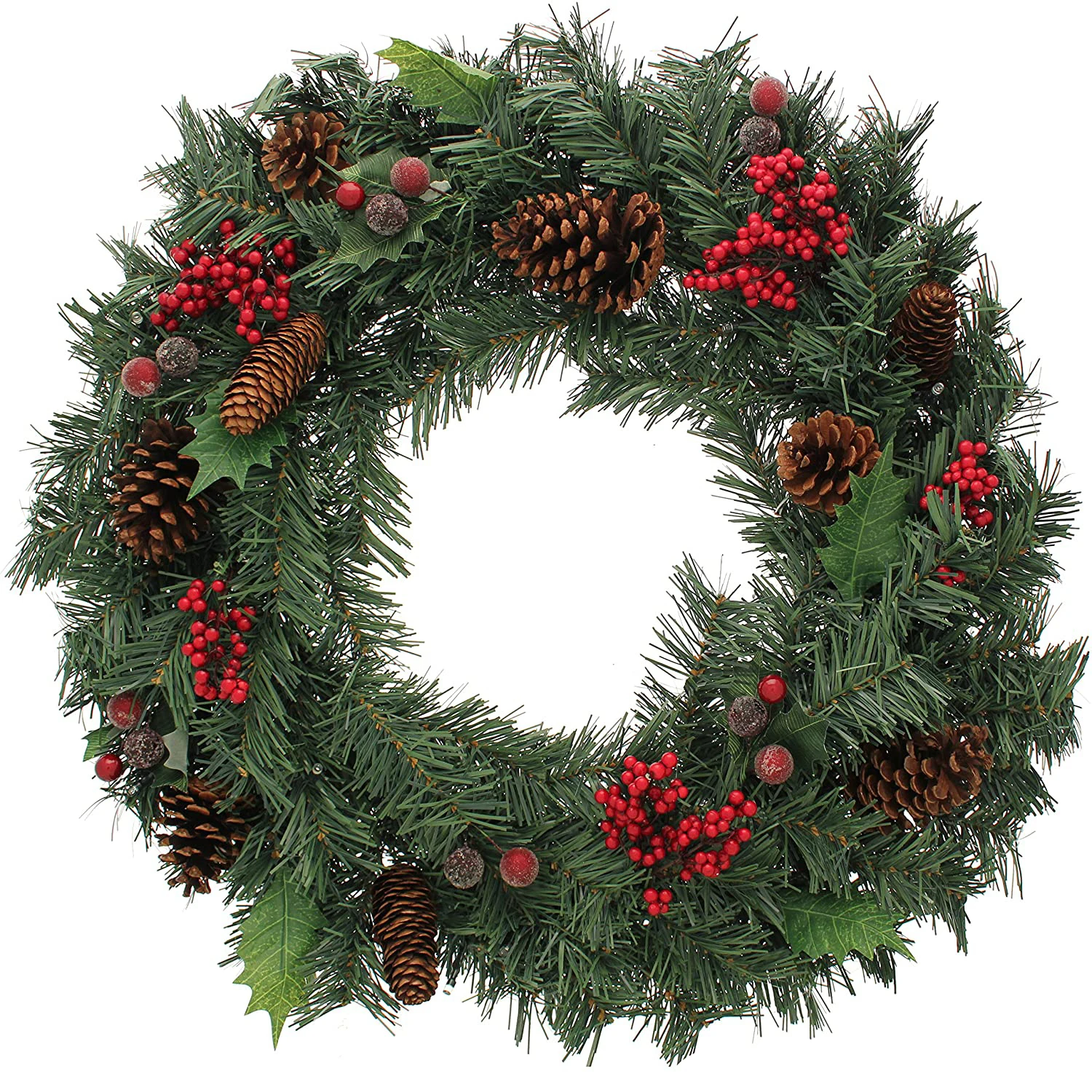 В венке есть различные ягоды и сосновые шишки, некоторые из которых украшены блестками