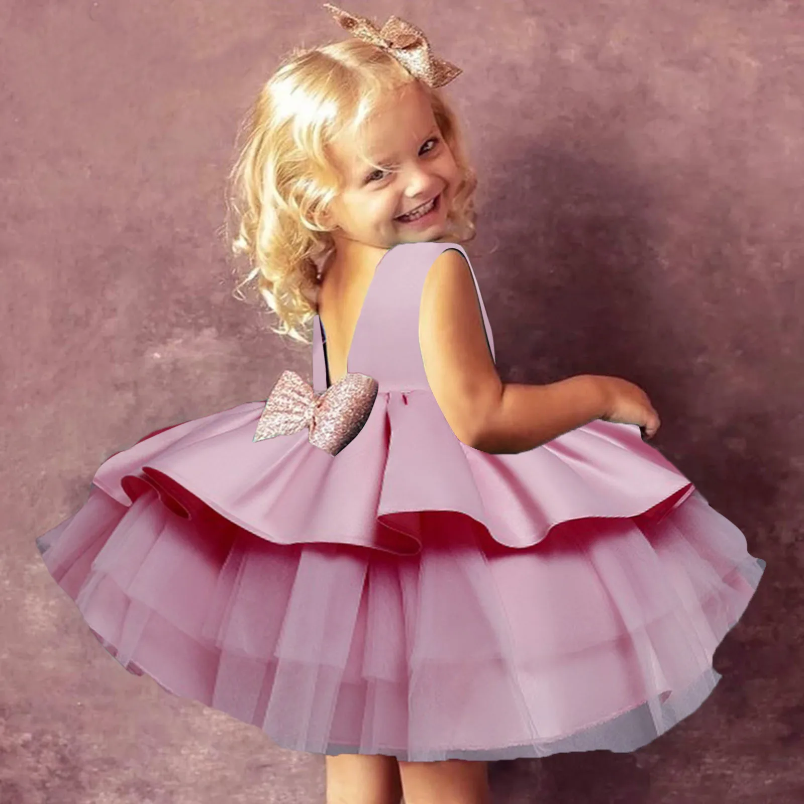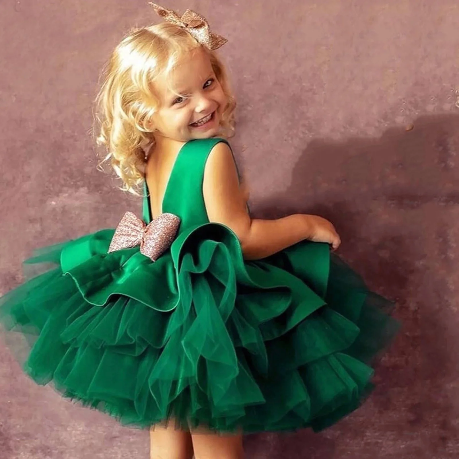 Платье для маленьких девочек на новый год 2022, платье принцессы, бальное платье с большим бантом и открытой спиной, новогодний костюм, детское рождественское вечернее платье
