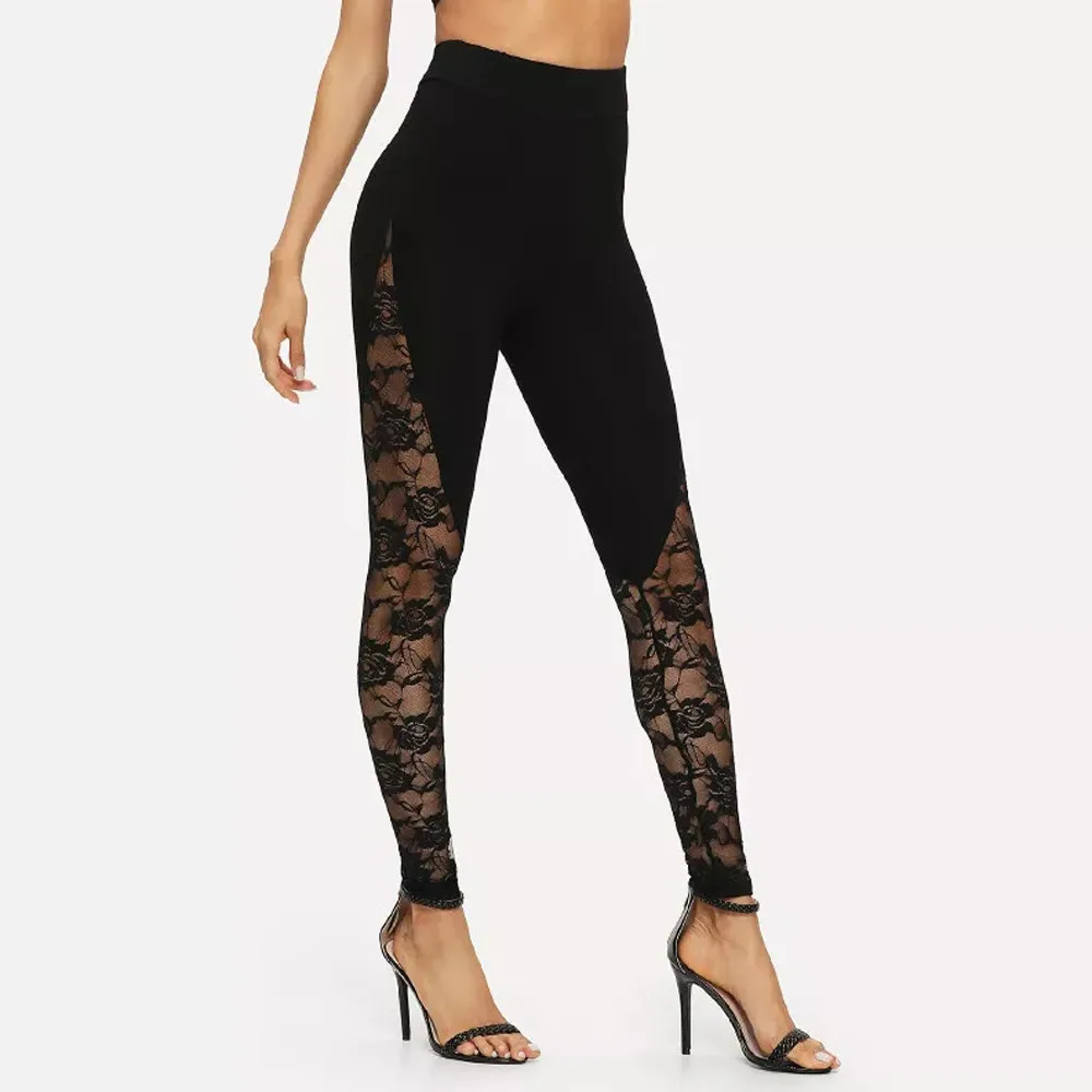 Сексуальные черные кружевные леггинсы, женские облегающие леггинсы с высокой талией, леггинсы с цветочным кружевом и боковой вставкой, леггинсы с вырезами, женские повседневные штаны для фитнеса