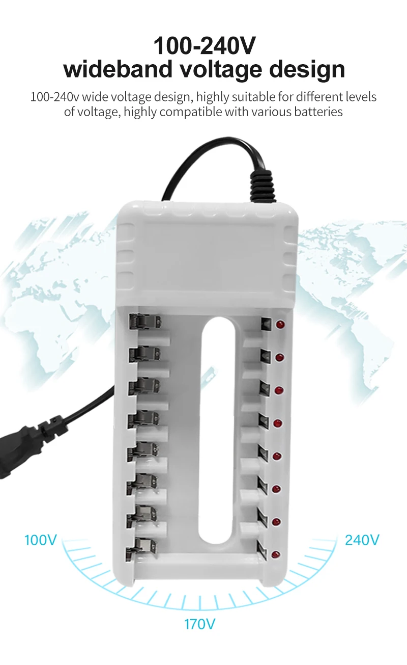 VOXLINK 8 слотов штепсельная вилка европейского стандарта AA/ AAA Ni-MH/Ni-Cd аккумуляторная батареяОписание:-- Название: AA/AAA Ni-MH/Ni-Cd аккумуляторная батарея--Материал: АБС-пластик. -- Вилка: штепсельная вилка европейского стандарта-Цвет: белый-- Вход: 220V/50HZ-- Выход: AA1.2V 120mAx8 ,AAA1.2V 120mAx8-Диапазон использования: аккумуляторная батарея AA/AAA-Посылка включает в себя: 1 зарядное устройство USB. Без аккумулятораПримечание: Время зарядки: емкость аккумулятора/ток зарядки * 1,2Подходит только для 1,2 V зарядное устройство для никель-кадмиевых или никель-металл-AAANi-MH/Ni-Cd аккумуляторные батареи, не подходит для 1,5 V.Светодиодный светильник показывает состояние зарядки, но он не выключается, когда аккумулятор имеет полнокомпактный размер, портативный и многофункциональный дизайн