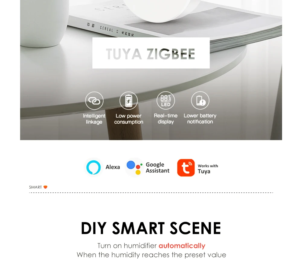 4. Новые добавлены с технологией компенсации температуры с Умной связью сцены с вашим кондиционером и увлажнителем воздуха, предлагая вашему дому с наиболее удобной температурой и влажностью, чтобы наслаждаться нашей умной жизнью.