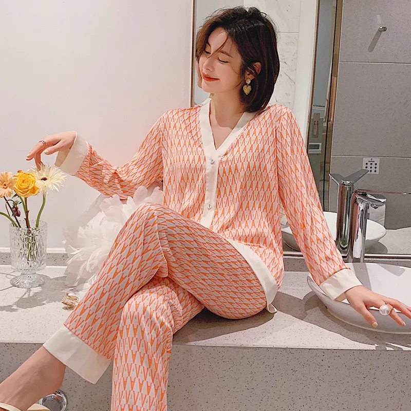 Пижамный комплект женский с V-образным вырезом, роскошная одежда дл...