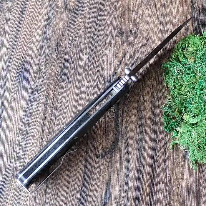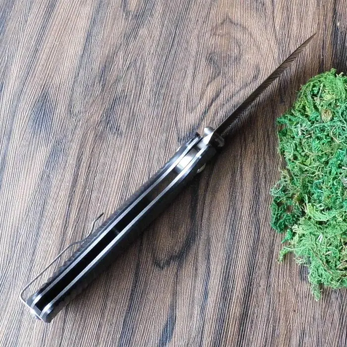 Ручка изготовлена из G10, прочного современного материала с отличными характеристиками: высокая термостойкость и устойчивость к химическому воздействию. По бокам ручки есть рифленая подкладка, поэтому нож не скользит и «удобно сидит» в руке. Также ручка имеет металлический зажим, который позволяет разместить нож на поясе во время транспортировки.