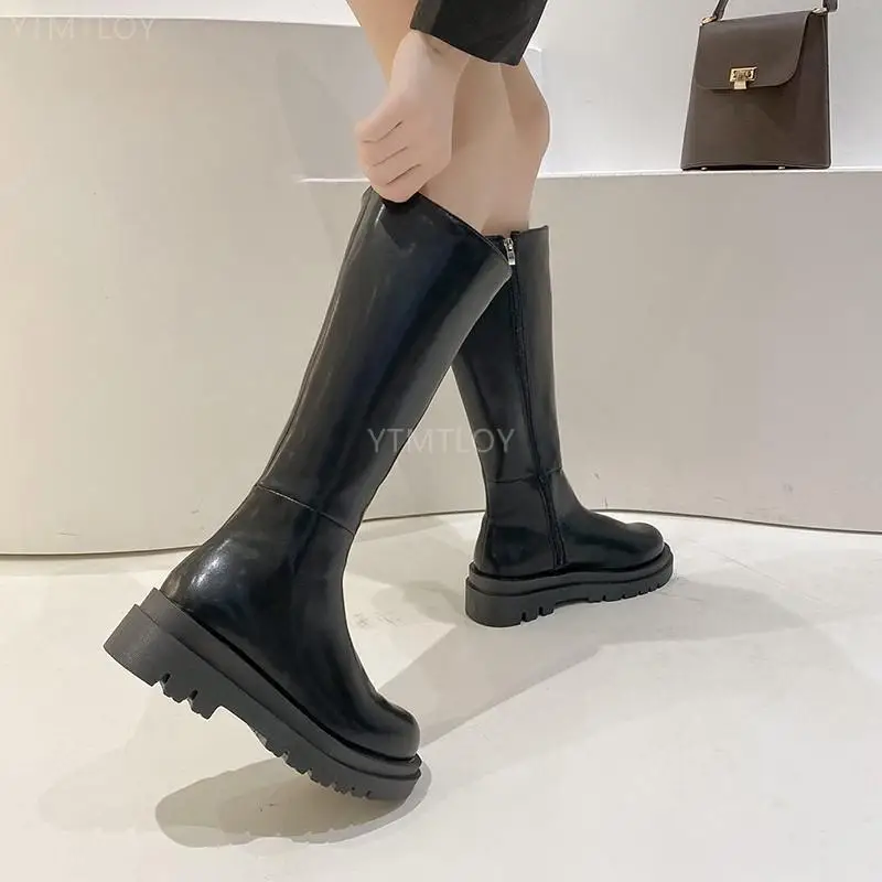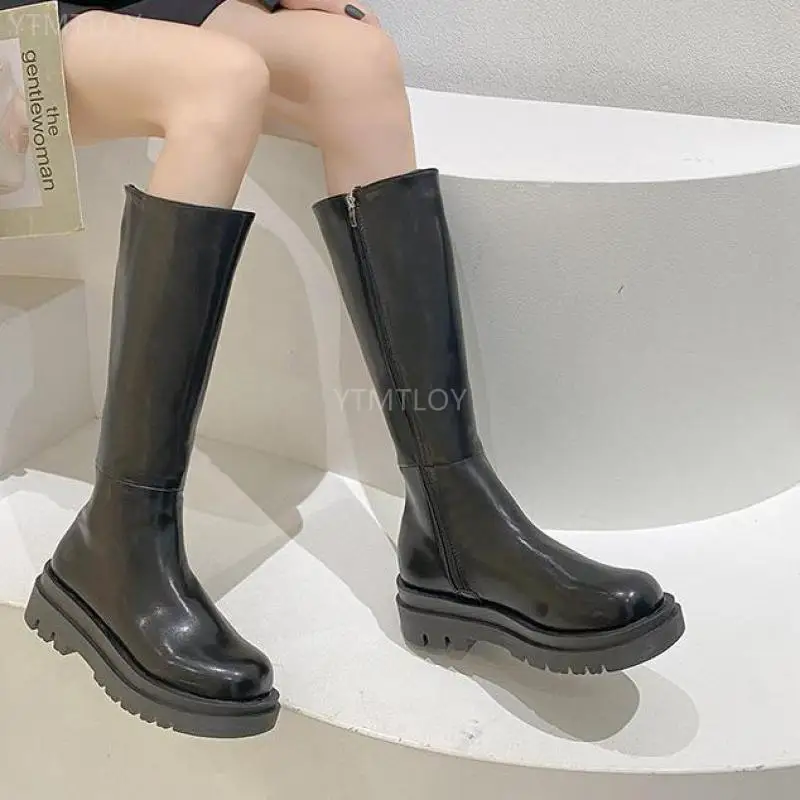 Женские кожаные сапоги до колена на платформе, осенне-зимние сапоги...