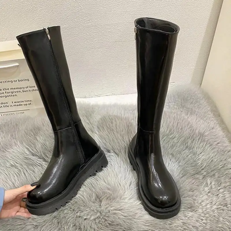 Зимние плюшевые сапоги до колена, женские черные кожаные боевые сап...