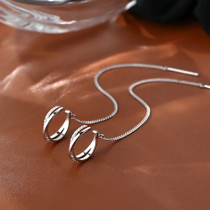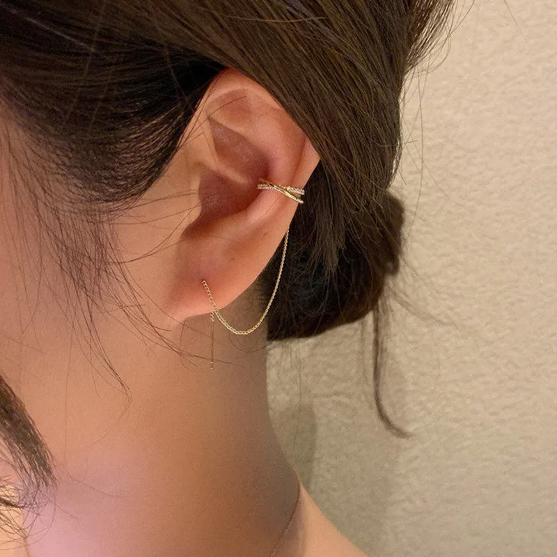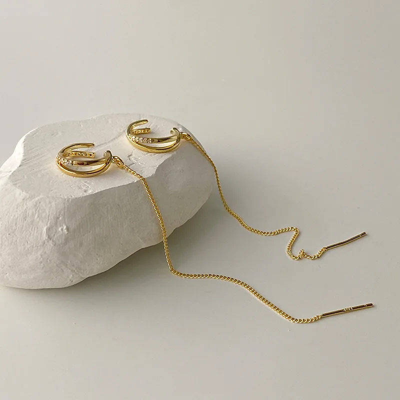 Серьги-клипсы Huggie с микрозакрепкой цирконием, длинные кольца с цепочкой, накладные ушные манжеты, с золотымсеребряным покрытием, без пирсинга