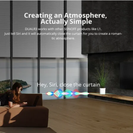 DUALR3 работает с другими продуктами SONOFF, такими как L1. Просто скажите Siri, и он автоматически закроет занавес для вас, чтобы создать романтическую атомосферу.