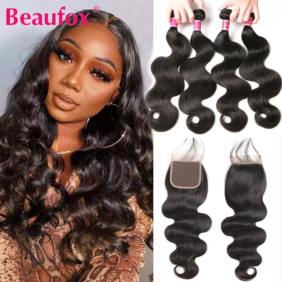 Beaufox индийские волнистые пряди с закрытием человеческие волосы плетение 4 пряди с закрытием 30 пряди волос с кружевной застежкой 5 шт.