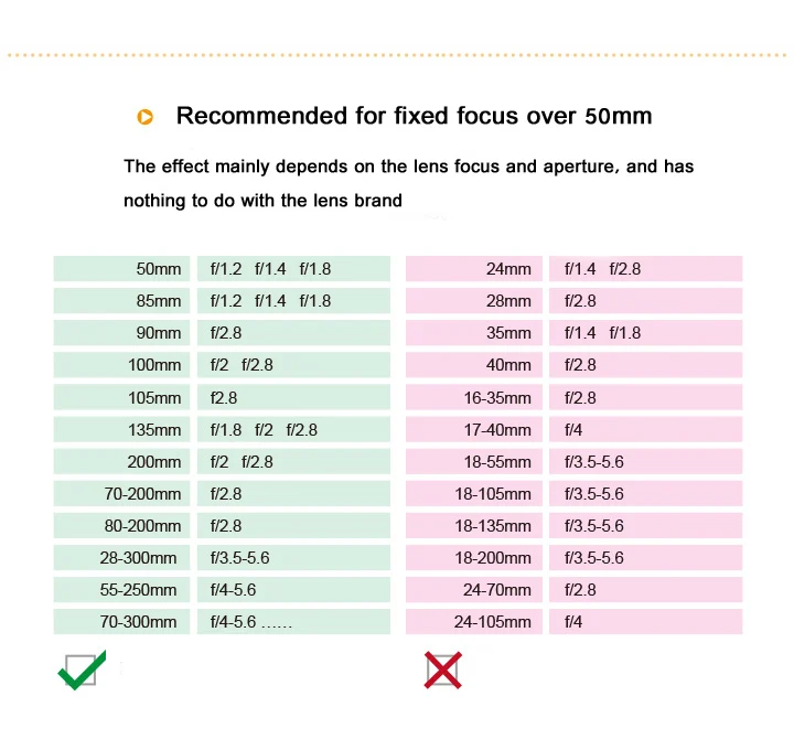РекомендуетсяДля фиксированного фокуса более 50 мм. Эффект в основном зависит от фокусировки объективаИ диафрагмы, и не имеет ничего общего с брендом объектива.