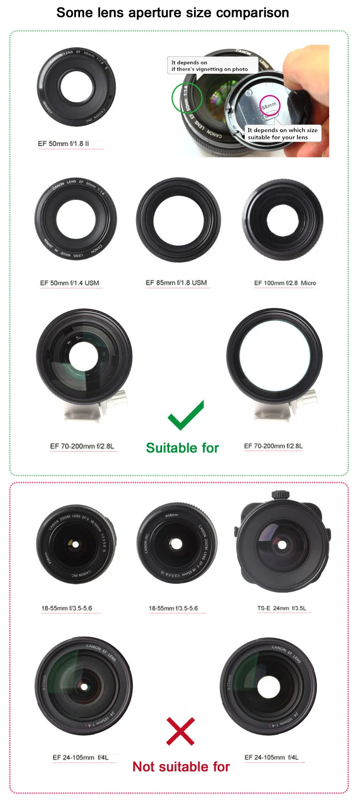 ТамМожет быть большой темный угол (виньетка) или даже не работать для других линз сНебольшая диафрагма/широкоугольный и большая часть зум-объектива, поэтому не рекомендуется.