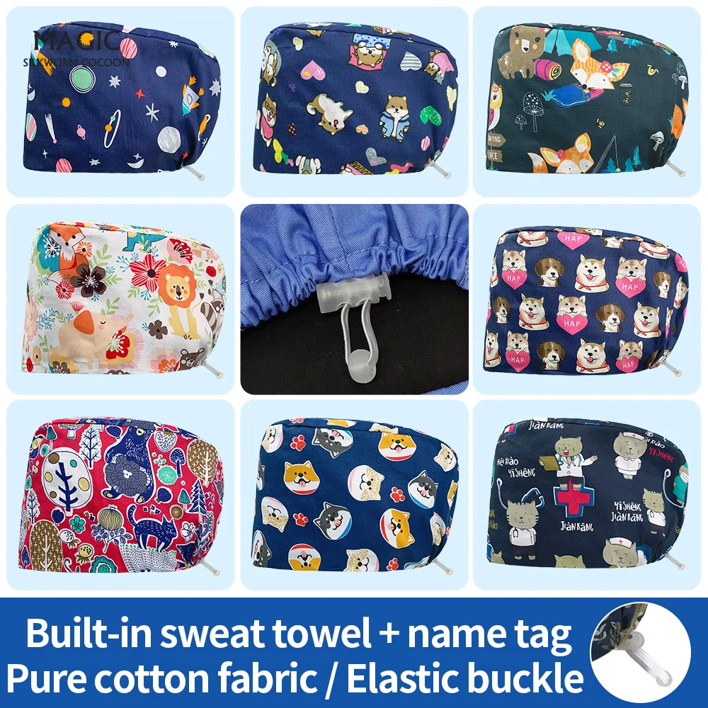 Шапка медсестринская с принтом животных, мягкая впитывающая пот пол...
