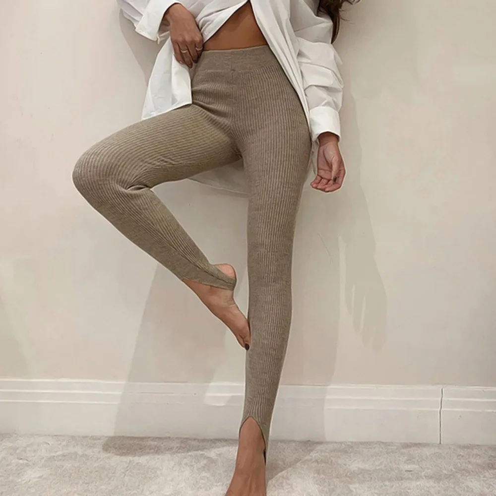 Женские трикотажные леггинсы в рубчик, Модные Бежевые хлопковые базовые брюки с высокой талией для фитнеса, Женские повседневные универсальные эластичные облегающие леггинсы