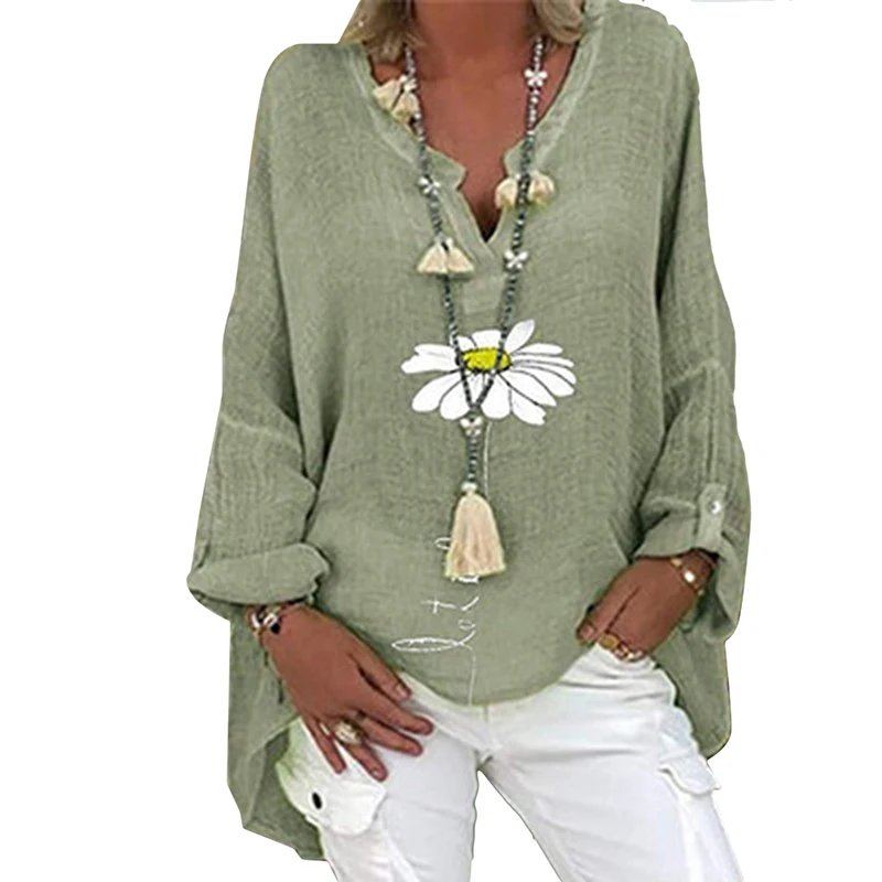 Рубашка женская с V-образным вырезом, Повседневная блузка из хлопка и льна в стиле бохо, топ с длинными рукавами