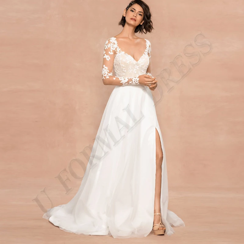 Женское свадебное платье с V-образным вырезом, длинным рукавом и от...