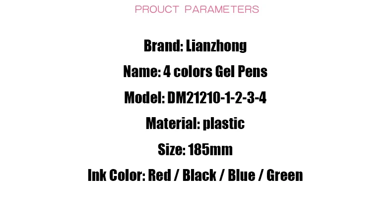 Бренд: UMEНазвание: гелевая ручка 4 цветовМодель: DM21210-1-2-3-4Материал: пластикРазмер: 185 ммЦвет чернил: красный/черный/синий/зеленый