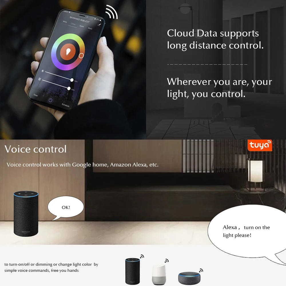 ● Tuya APP Облачное управление, поддержка включения/выключения, RGB цвет, цветовая температура и регулировка яркости, Задержка включения/выключения светильник, таймер, функция воспроизведения сцены и музыки.