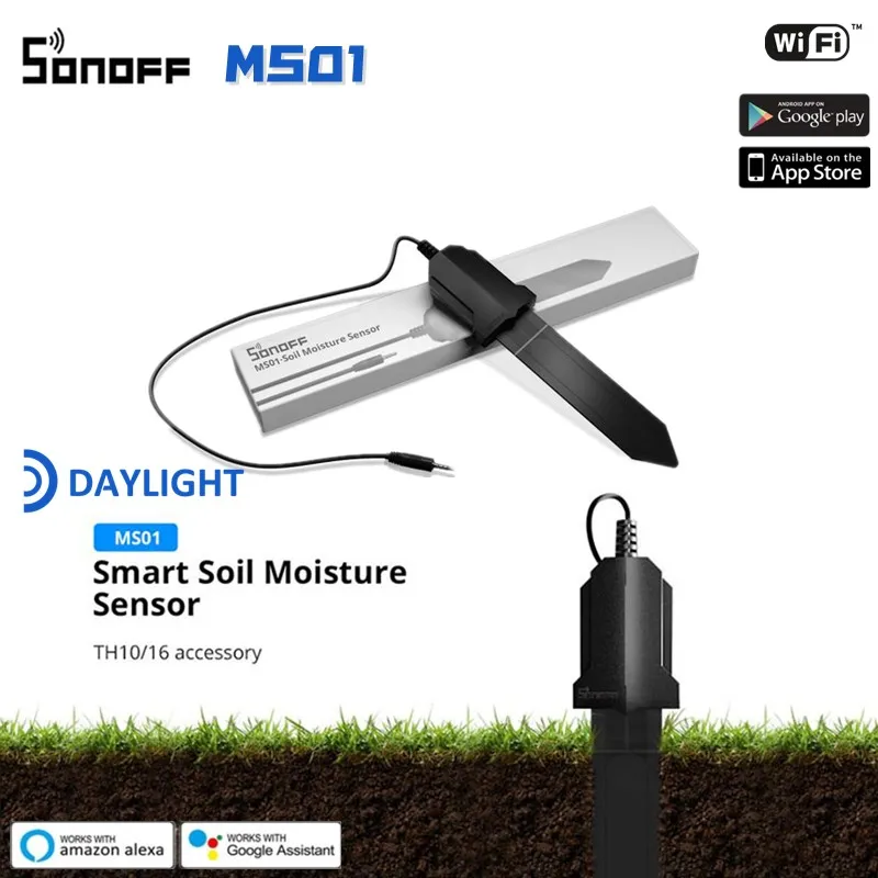 MS01 является аксессуаром TH10/TH16, работает с SONOFF TH10/16, чтобы точно измерить влажность почвы и отправить данные на ваш мобильный телефон. MS01 может поливать регулярно и проверять влажность почвы в любое время и в любом месте, чтобы вырасти ваши цветы более здоровыми.* TH10/16 умный Wi-Fi переключатель с контролем температуры и влажности.Используя MS01 и TH10/16 DIY умное устройство полива, когда уровень влажности почвы достигает значения установки, система полива, подключенная к TH10/16, автоматически включится/выключится.MS01 совместим с Google Assistant, вы можете попросить своего Google Assistant о влажности.MS01 имеет Водонепроницаемость IP55 позволяет поливать ваши цветы без необходимости извлекать датчик, даже оставив его под дождем.MS01 делает ваш сад более удобным и умным.