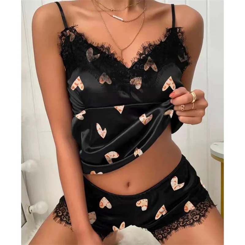 Женская пижама, Сексуальный Атласный пижамный комплект, Черная кружевная Пижама с V-образным вырезом, милая майка без рукавов и шорты