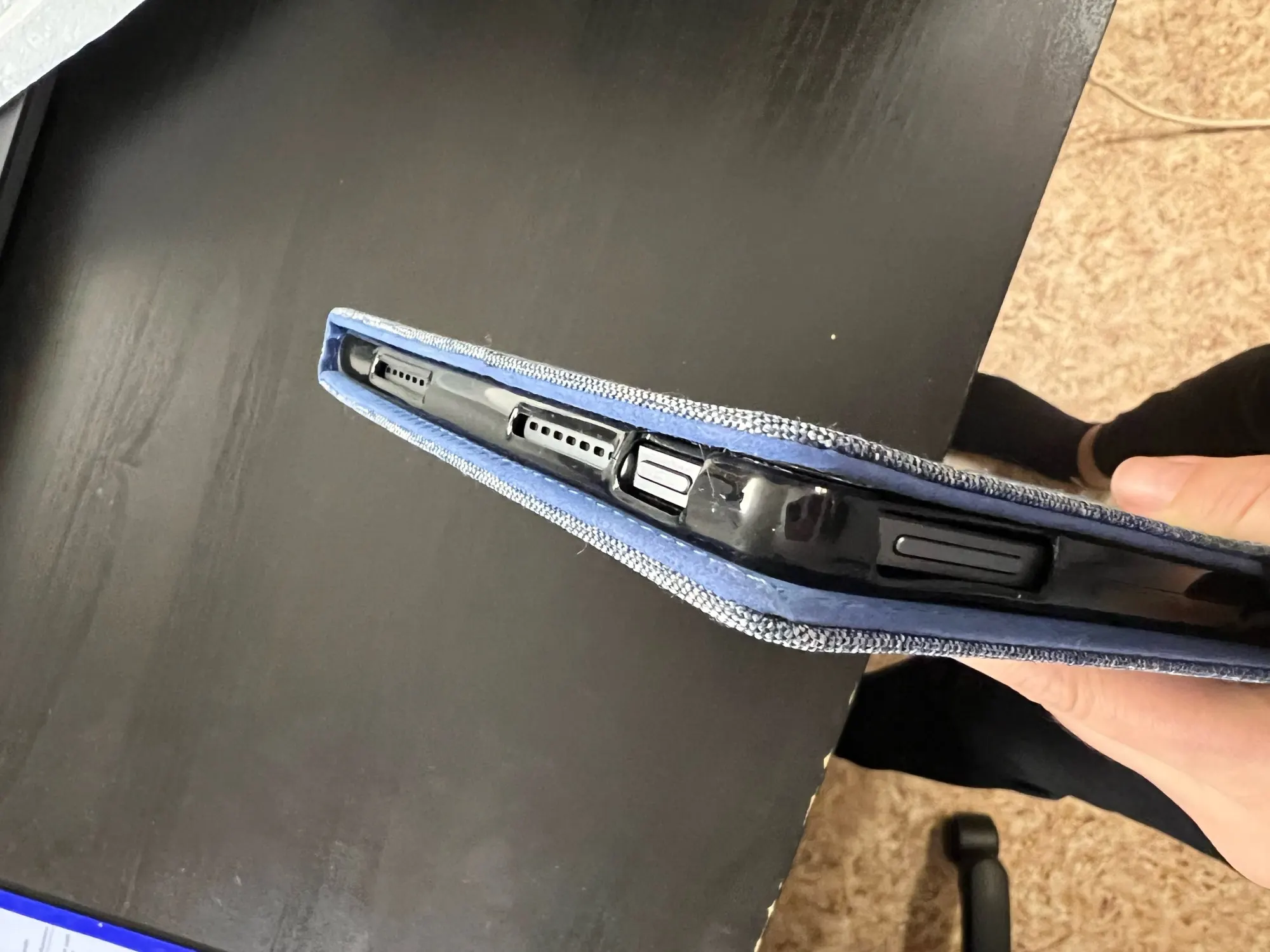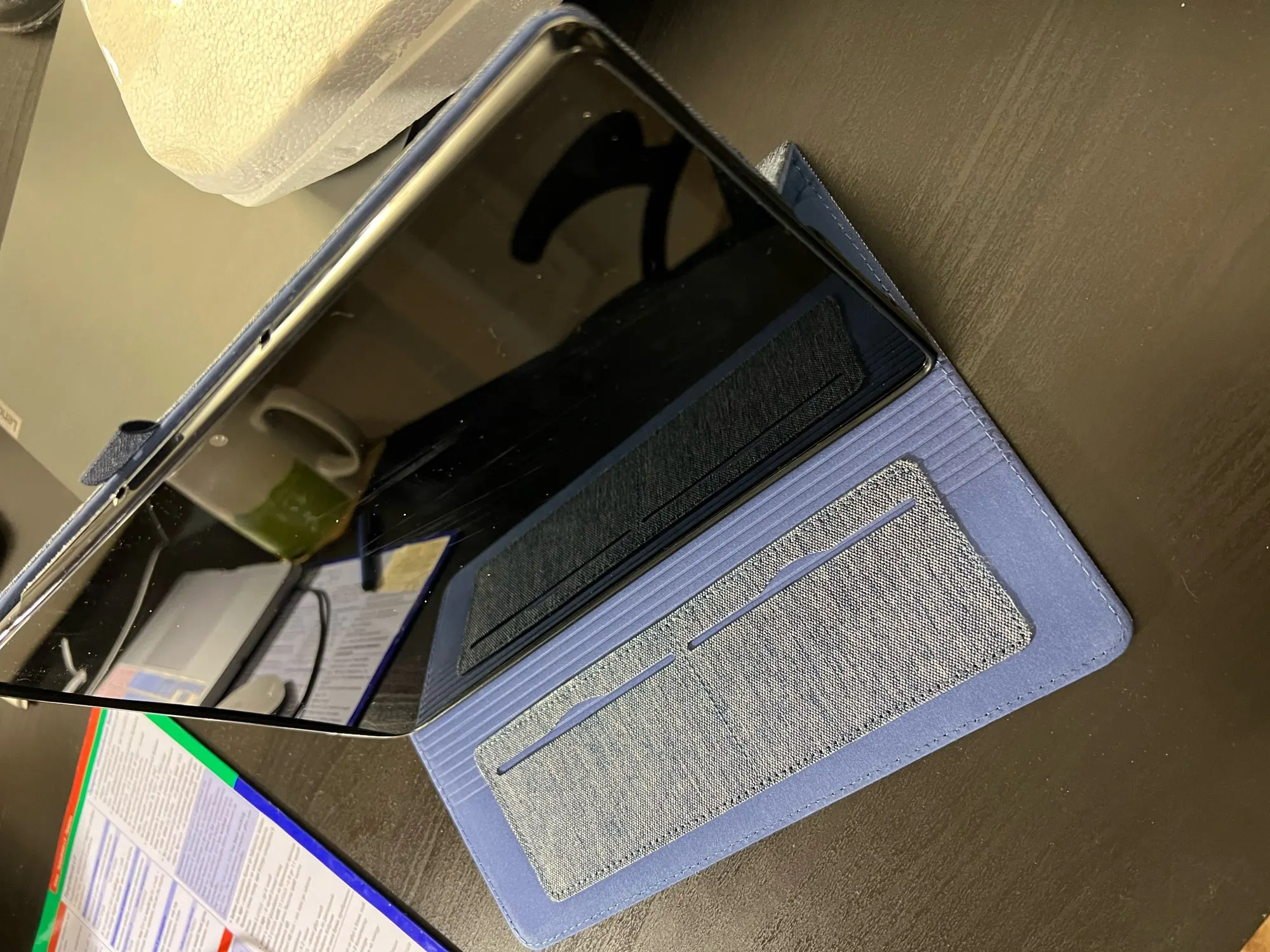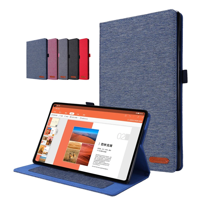 Удобный чехол, приятный материал, похожий на джинсы, надежно устанавливается на подставку