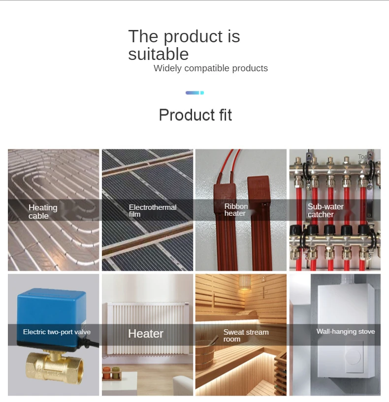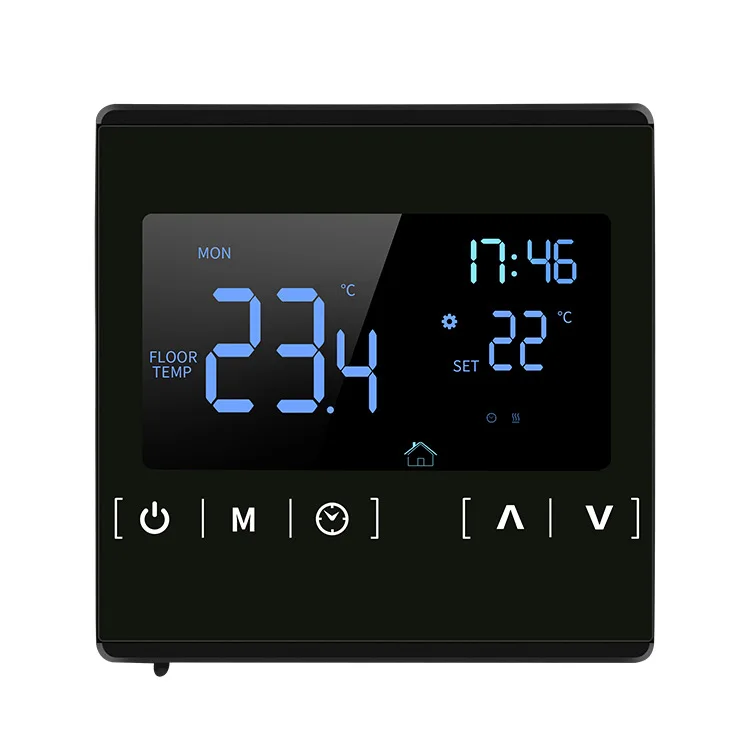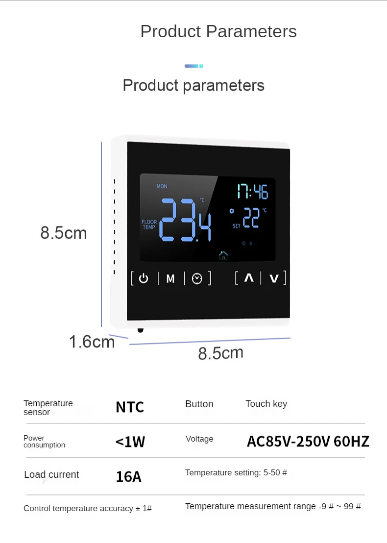 Новый Усовершенствованный смарт-термостат, сенсорный ЖК-экран, электрическое Напольное отопление, электрический нагревательный температурный контроллер Новые обновленные технические данные Рабочее напряжение: AC85 ~ 240V 50/60Hz Точность: 1 ℃ Датчик зонда: NTC (10K) 1% @ 25 ℃ Максимальная нагрузка: 16А Температура рабочей среды: 0 ~ 70 ℃ Диапазон регулировки температуры: 5 ~ 50 ℃ Кнопка: сенсорная кнопка Выход: реле переключателя -План работы: Установите Цикл каждые 1 неделю -Способ установки: настенный -Размер (мм): 85*85*16 > Функция постоянной температуры 1. Функция памяти Запомните все настройки после внезапного отключения питания. Когда питание включено снова, вам не нужно сбросить его. 2. Программируемая функция Шестиступенчатая программируемая Настройка контроля температуры, программируемый 5 + 2 или 6 + 1. 3. Вставные и внешние два датчика. Включает 3 м кабель внешнего датчика. 4. Функция блокировки ребенка Блокировка термостата во избежание неправильной работы детьми. 5. Подходит для различных систем электрического отопления Термостат подходит для электрических нагревательных устройств, таких как нагревательные кабели, нагревательные колодки и нагревательные пленки. 6. Сенсорный ЖК-экран с черной подсветкой. 7. Функция антифриза: В режиме выключения термостат автоматически включит нагревательное устройство при температуре ниже 5с градусов, а при комнатной температуре выше 7с градусов, термостат автоматически выключает нагревательное устройство. (Этот параметр можно отключить в дополнительных настройках). 8. Поддержка коммутационного дисплея по Фаренгейту (только модели WiFi). Посылка включает в себя: 1 термостат 1X3 метра внешний датчик 2 винта Руководство пользователя на английском языке-1 шт.