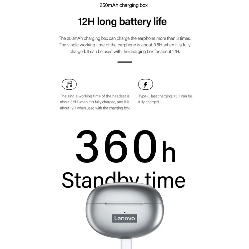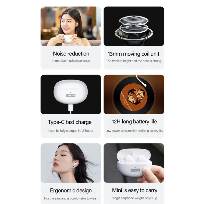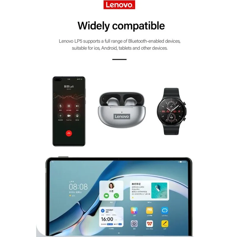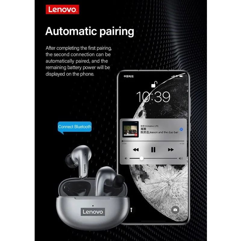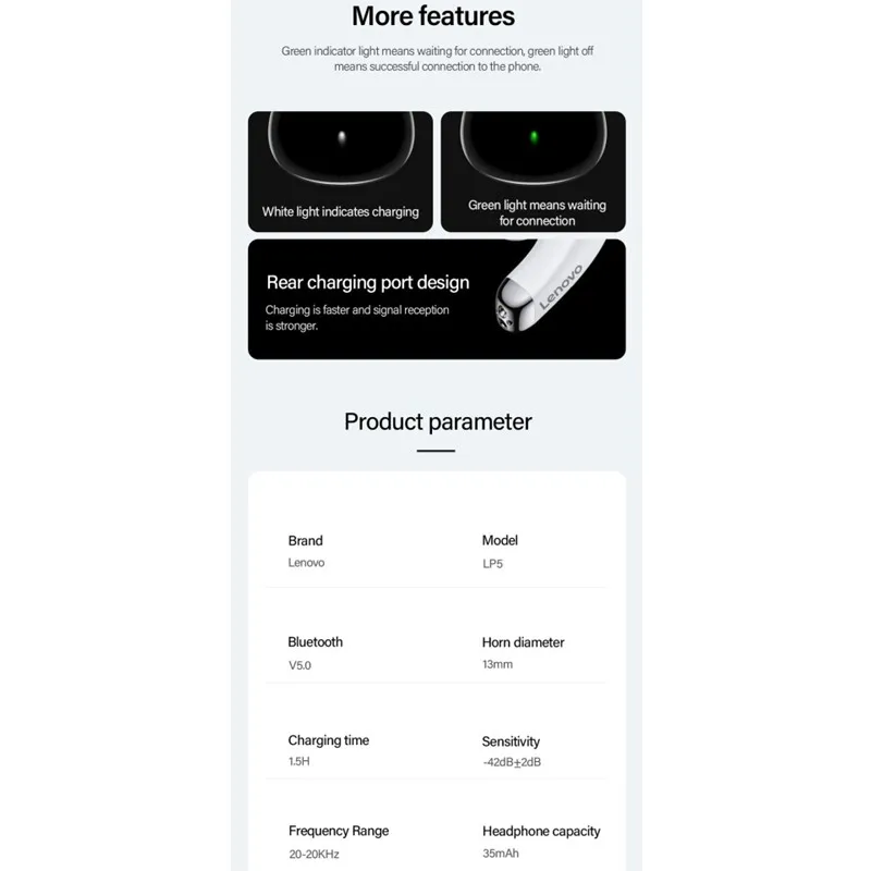 * Подавление шума In-ear Type + ENC: Lenovo LP5 подавит фоновый шум для четких голосовых записей и легко слышит звонки.