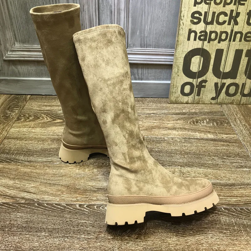 Женские рыцарские сапоги на толстой подошве, женские эластичные тонкие сапоги, сетчатые красные замшевые сапоги до колена, обувь для весны и осени 2021