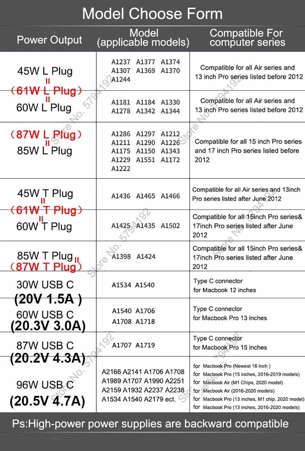 2.Пожалуйста, сделайте выбор в соответствии с моделью вашего компьютера, пожалуйста, проверьте следующие детали! 61 Вт/87 Вт EU & US с T & L кабелем = для Magsaf * 1/2 EU & US 60W & 45W (= 61W)/85W (= 87W ). Если у вас есть какие-либо вопросы о товаре, пожалуйста, свяжитесь с нами!