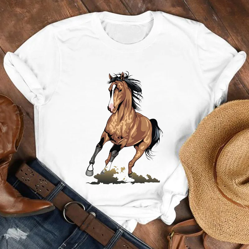 Женская футболка с мультяшным рисунком бегущей лошади, модные женские футболки с круглым вырезом, базовые белые футболки, летний топ, женская футболка, 2021