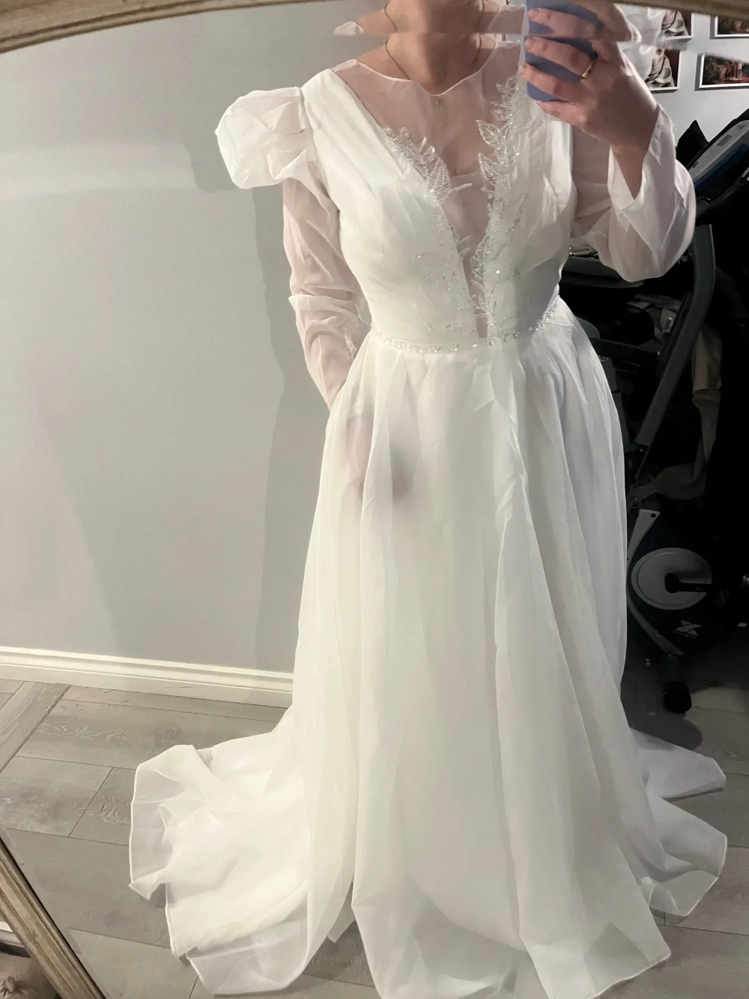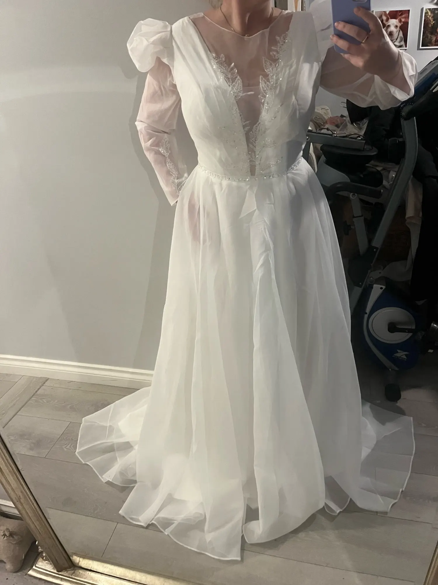 Великолепное платье! Некоторые изменения должны быть сделаны с шейной частью, добавив нижнюю юбку и регулируя рукава, но, честно говоря, удивительно по цене! Я влюблен! Порекомендовать продавцу 10/10. Я беспокоился о покупке, но это официальный Свадебный склад.