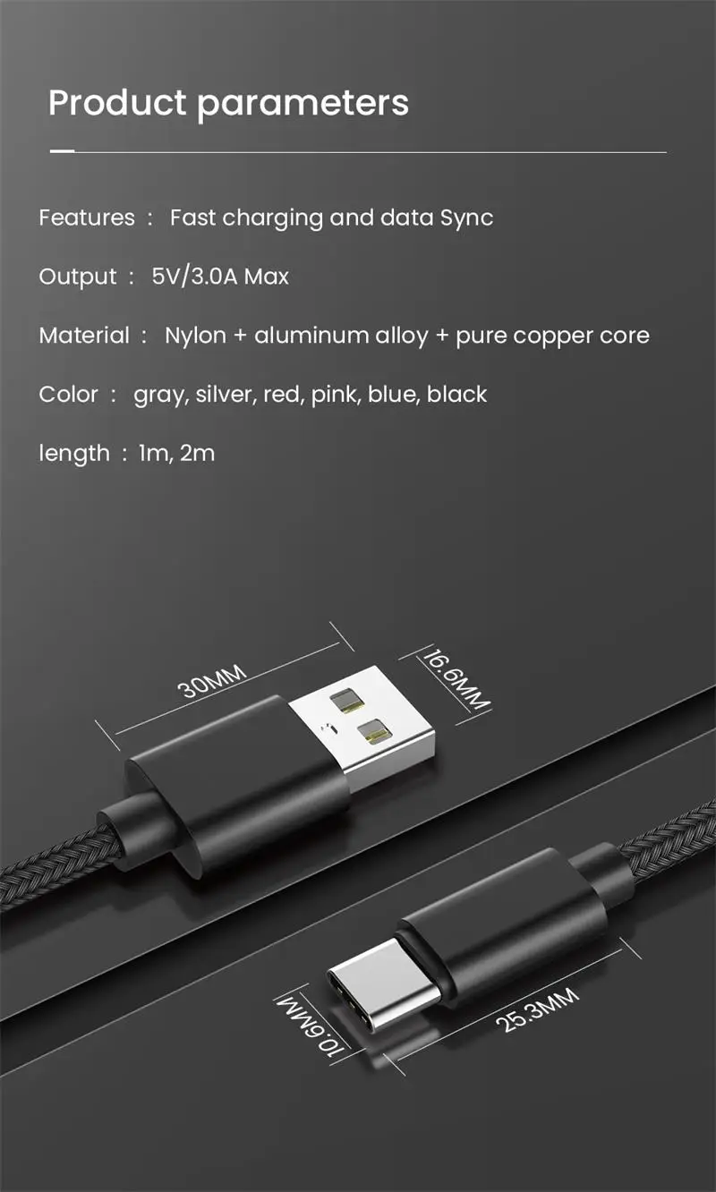 1 м2 м3 м черныйкрасный для Samsung Huawei USB Type C кабель для пе...