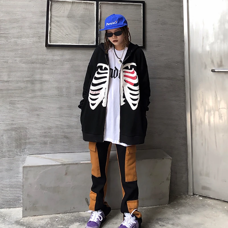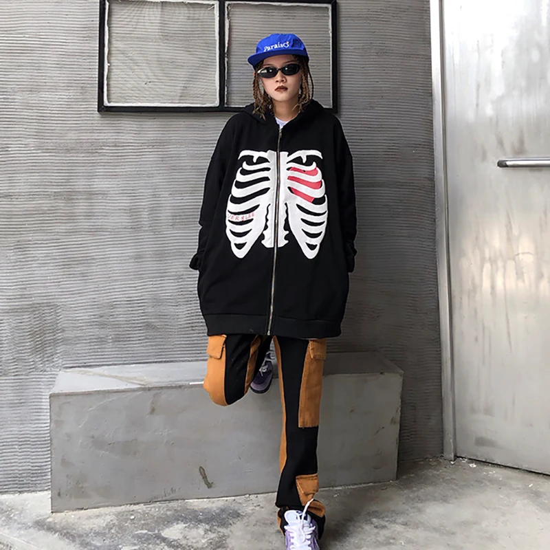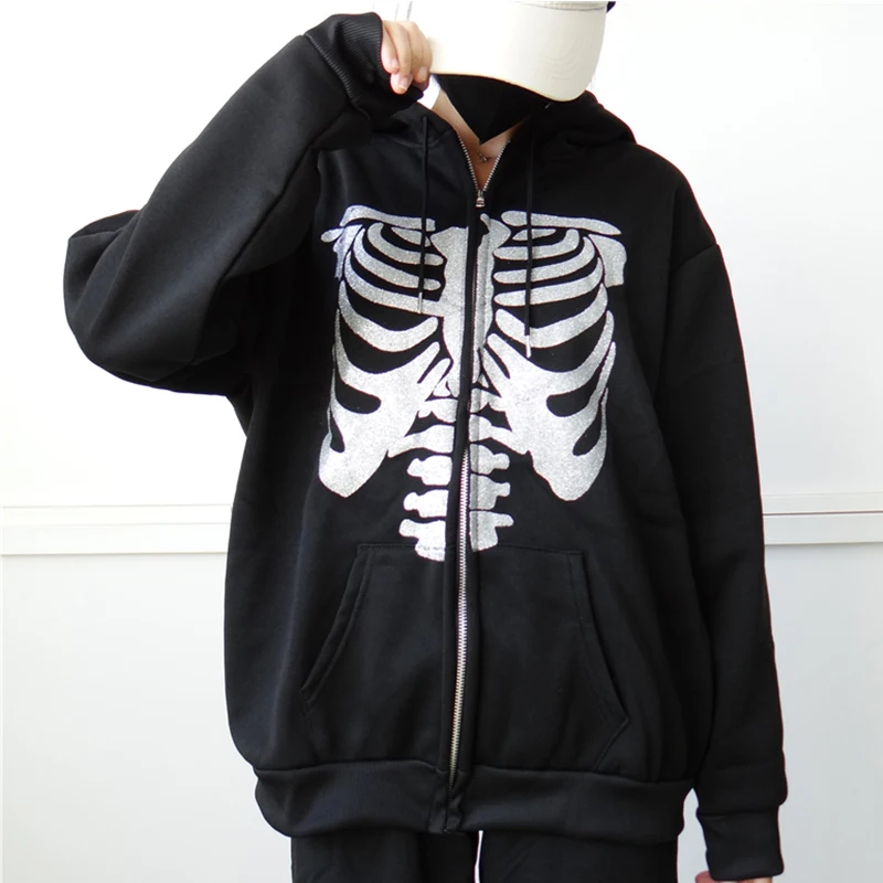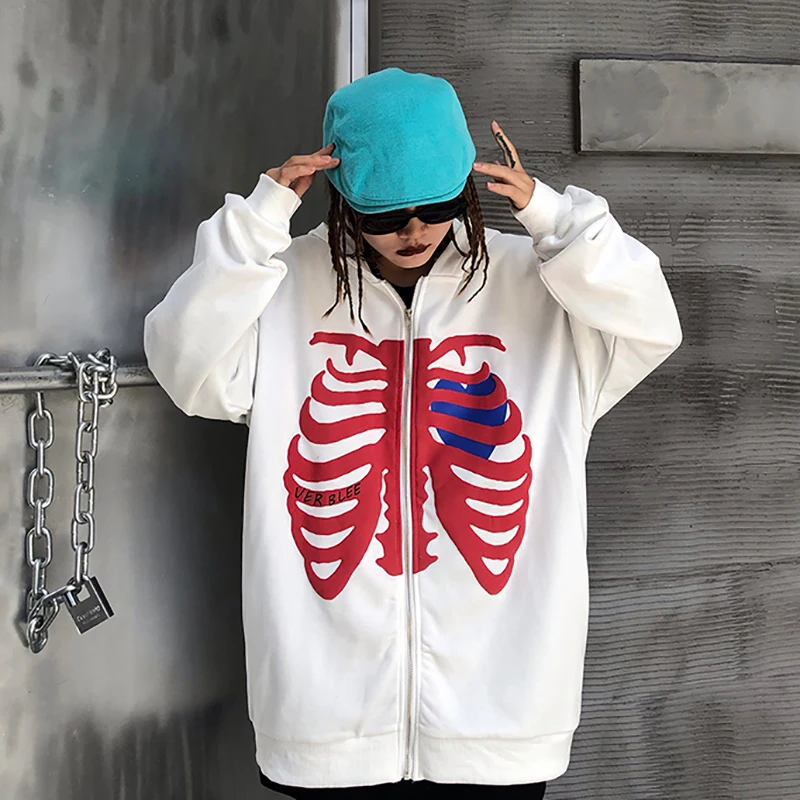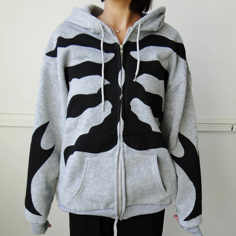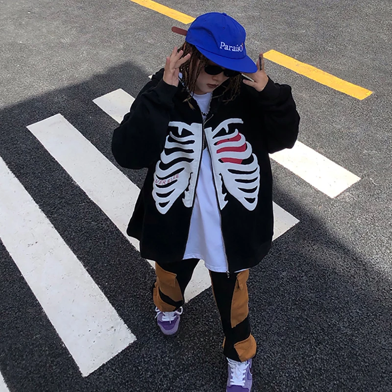 Свитшот Y2K мужской на молнии, готический Свитшот со скелетом, Худи оверсайз, пальто с длинным рукавом, винтажная одежда в стиле Харадзюку, гранж 90-х годов, на осень