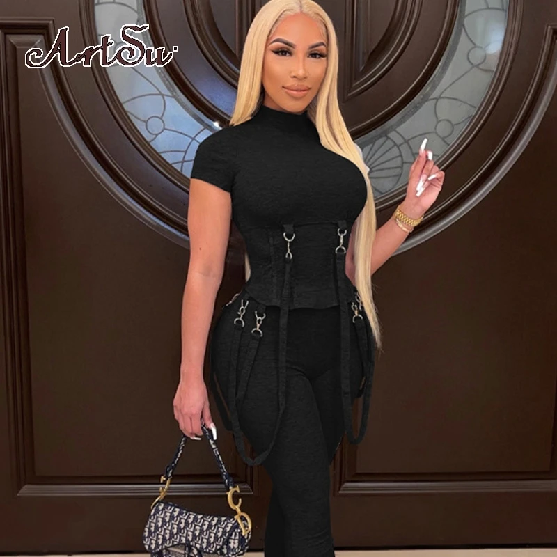 Artsu черный комплект из двух предметов, женский спортивный костюм, футболка с коротким рукавом, бандажный ремешок, укороченный топ, спортивные брюки-карандаш, уличная одежда, брюки