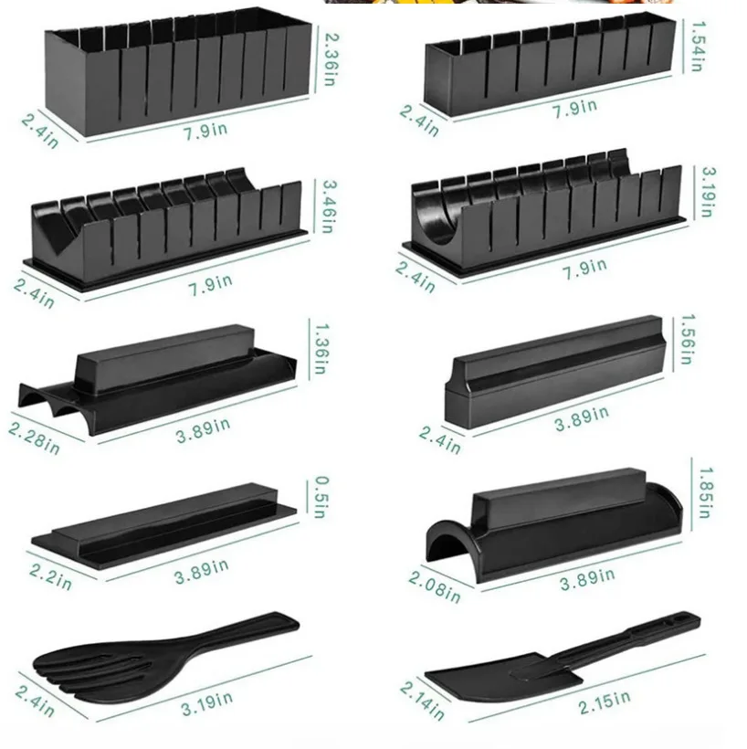 Особенности:1. Коврик для суши закатывается в аккуратный цилиндр для формирования риса, водорослей, овощей и морепродуктов, которые составляют 2. Не повреждают антипригарную и другую кухонную утварь. 3. Этот продукт похож на ракетную пусковую установку, но он работает как шприц, чтобы сделать суши. С ним мы можем сделать вкусные суши в несколько шагов (наполнение, закрытие, толкание, обертывание, резка)!Посылка включает:10 шт. комплектов