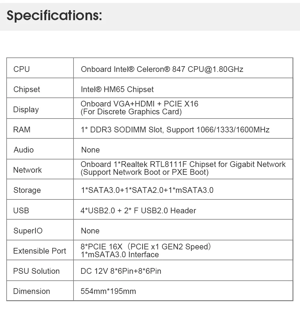 BTC-T37Описание товара:Этот продукт представляет собой набор материнских плат для горнодобывающей машины с низким энергопотреблением, низким тепловым производством, энергосбережением и энергосбережением.Слот для памяти, 8 графических карт.Настоящая работа для вас длительная и полезная.Стабилизирующий конденсатор напряжения может обеспечить стабильное напряжение для вашего силового оборудования.Он может обеспечить тихую производительность, низкое энергопотребление, уменьшить выработку тепла, энергосбережение и безопасное использование.BTC-T37Характеристики:1. Слот для памяти, 8 гнезд для видеокарты.2. Настоящая работа для вас длительная и полезная.3. Стабилизирующий конденсатор напряжения может обеспечить стабильное напряжение для вашего силового оборудования.4. Он может обеспечить тихую работу, низкое энергопотребление, уменьшить выработку тепла, энергосбережение и безопасное использование.BTC-T37Характеристики:Модель: BTC-37Чип: HM 77 чипДисплей: интегрированный VGA + HDMI + PCIEX 16 (для дискретной графики)Память: 1 * Разъем DDR3SODIMM, поддержка 1066/1333 / 1600 МГцАудио: нетСеть: 1 * интегрированный чипсет для гигабитных сетей (Поддержка сетевой загрузки или загрузки PXE)Место хранения: 1 SATA3.0 + 1 SATA2.0 + 3,3 ft SATA2.0.USB: 4 USB 2,0 + 2 передних разъема USB 2,0.Многофункциональная карта: ITE IT8772EПорт расширения: 8 x PCIE16X1 SATA3.0 + 1 * SATA2.0 + 1 * mSATA2.0 интерфейс жесткого дискаИсточник питания: ATX24 PINРазмер: 18,504x7,677 дюймовЦвет: черный.BTC-T37Посылка включает в себя:1 Материнская плата для горнодобывающей машины BTC-37 (металлический чехол не входит в комплект)Предупреждение:1. Фактический цвет изделия на фото может быть s светильник ly отличаться от показанного на изображении из-за различных настроек монитора и светильник эффект. Возможны отклонения на 1-2 дюйма вследствие измерений вручную.