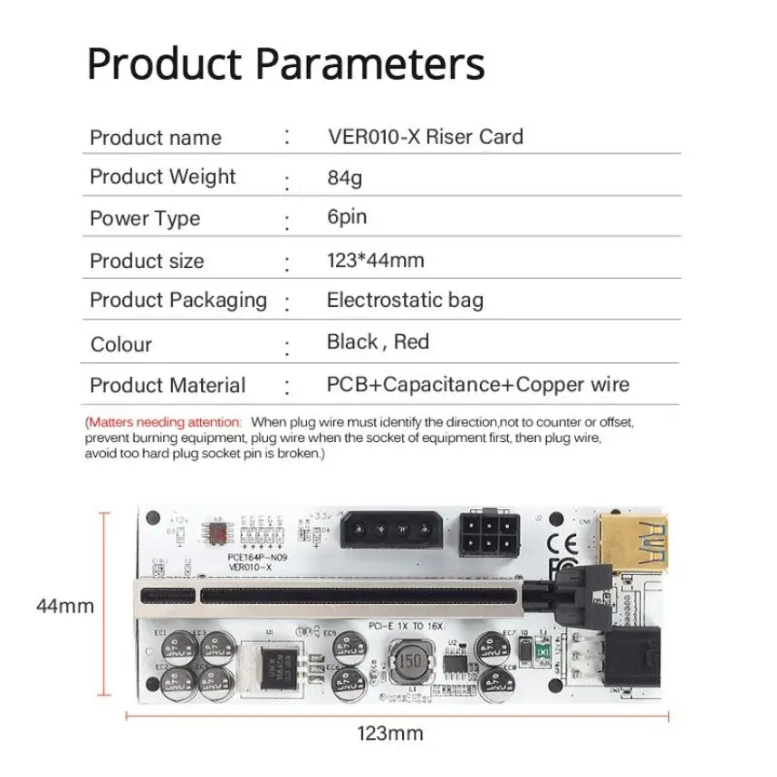 Плата расширения PCI-E 1X до 16X (VER010-X)Модель: VER010-X [8 конструкция конденсатора + несколько динамических рабочих индикаторов]Название: PCI-ERiser видеокарта удлинительПроизводительность продукта: удлинитель видеокарты 6PIN интерфейс (16A мощность источника питания) для увеличения источника питанияИнтерфейс: PCI-E 16XРазмер изделия: 123*44 ммUSB кабель: 150 смЦвет изделия: красный/черныйВес продукта: 125 г/компл.Материал изделия: тайваньское золото + PceAПоддержка системы: Ll nx / xp / win7, 8, 10